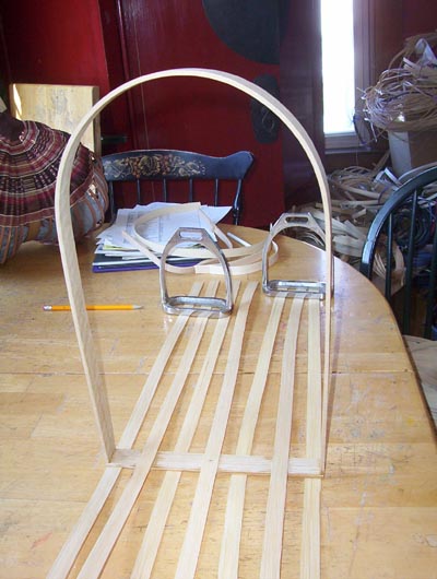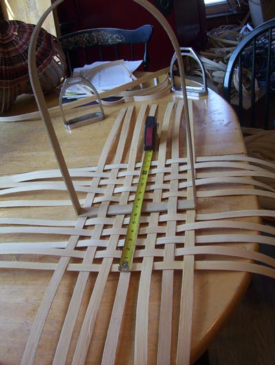 Mark centers of the (10) 33" inch long pieces of flat reed Weave the first piece beside handle bottom in an opposite over/under pattern, lining up the center mark with the 37" center weaver Do the same on opposite side of handle, finish weaving in the remaining 33" inch pieces in an over/under pattern