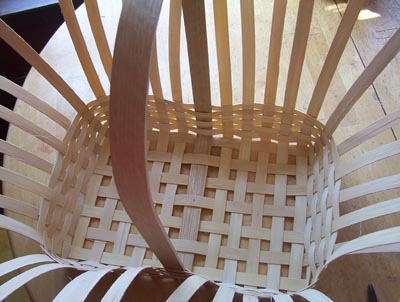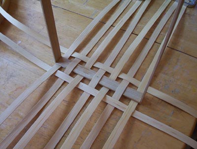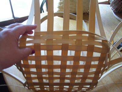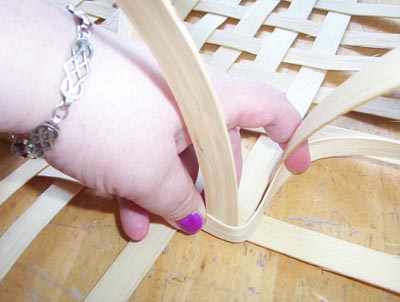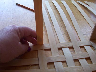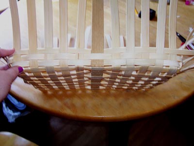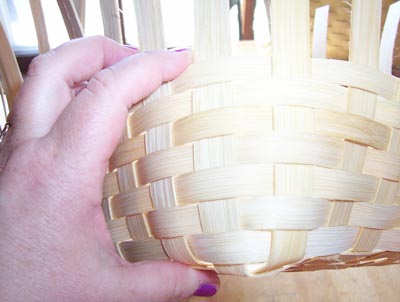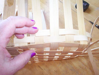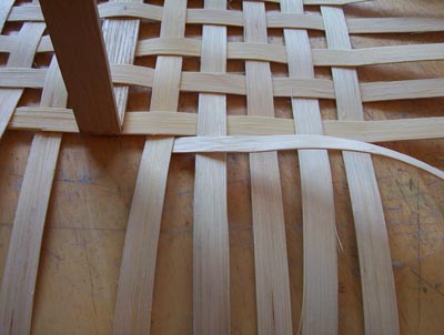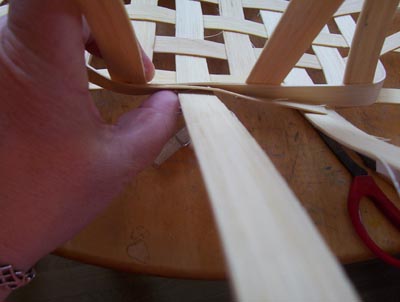 ![]() Start a soaked/wet 1/2 inch flat weaver as shown. Weave around the bottom in an over/under pattern |